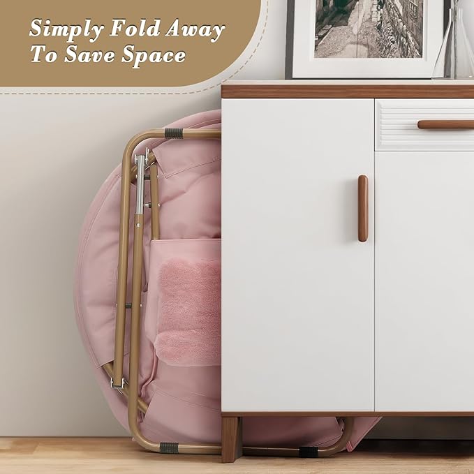 Athena Collection Comfy Saucer Chair with Headrest Oversize Round Cozy Chair Folding Chair Faux Fur Metal Frame Foldable Reading Chair Accent Chair for Bedroom Living Room Set of 2, Pink