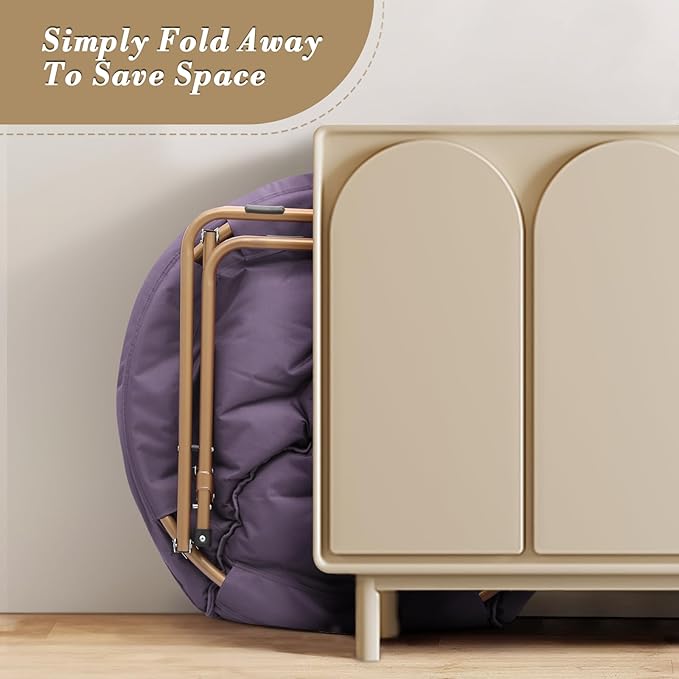 Athena Collection Saucer Chair with Ottoman - Modern Foldable Round Cozy Chair - Purple Faux Fur - 300 lbs Capacity - Ideal for Bedroom, Living Room, Gaming, Reading, Camping