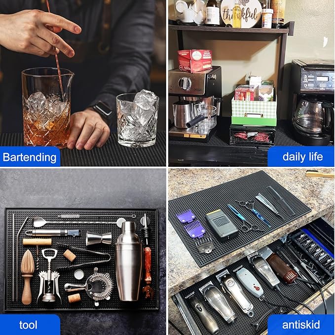 - 【Versatile Use】 Serving as more than just coasters, the KUKLIPJIM 12 x 18 rubber bar mats are perfectly designed for home bars, bartending, coffee machines, dining tables, and even barber's stations. Their flexible design allows you to utilize these mats in any setting that requires a non-slip surface.