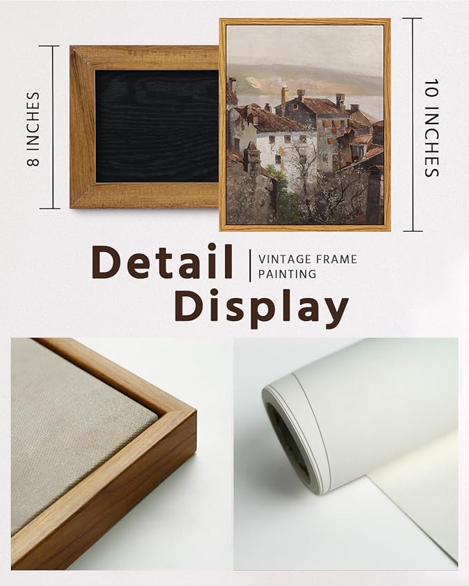 VIYYIEA Vintage Framed Canvas Wall Art, European Towns Landscapes Art, Living Room Hallway Bedroom Library Rustic Retro Neutral Decor, Small Antique Country Town Picture Paintings,8x10 Inch