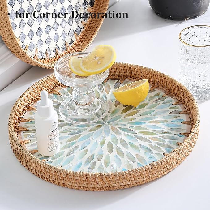 Round Rattan Tray with Mother of Pearl Inlay, Rattan Serving Tray for Coffee, Bread, Fruits, Decorative Wicker Tray for Table Decor, Home Decor, Kitchen Island Decor (Ambilight, 11.8")