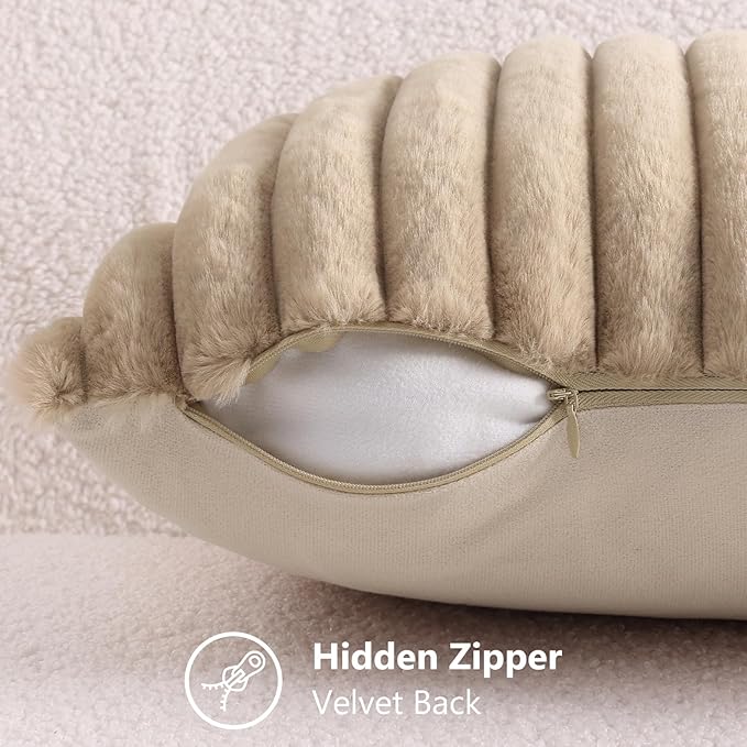 decorUhome Fall Faux Fur Throw Pillow Covers 12x20 Set of 2, Decorative Soft Plush Striped Neutral Couch Euro Pillow Covers with Velvet Back for Sofa, Bed, Living Room Home Decor, Light Khaki Brown
