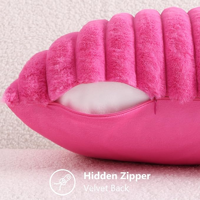 decorUhome Faux Fur Throw Pillow Covers 18x18 Set of 2, Decorative Soft Plush Striped Neutral Couch Euro Pillow Covers with Velvet Back for Sofa, Bed, Living Room Home Decor, Hot Pink