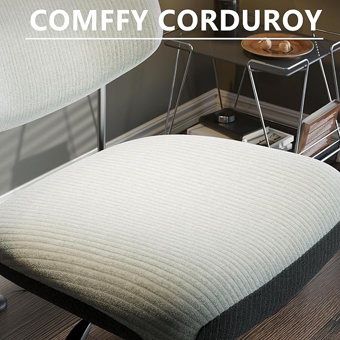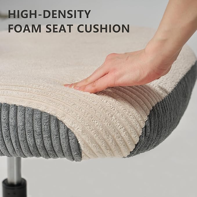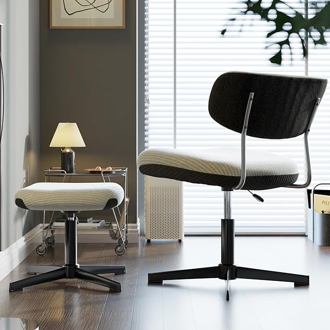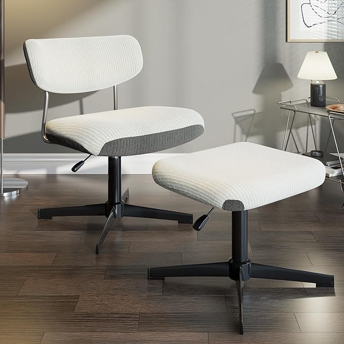 Swivel Criss Cross Chair, Accent Chair with Ottoman Set, Modern Armless Comfy Chair with Ergonomic Backrest, Corduroy Upholstered Seat, No Wheels, White & Grey
