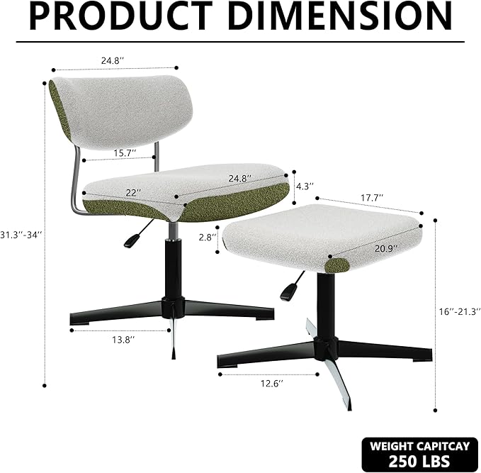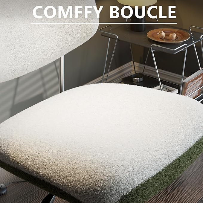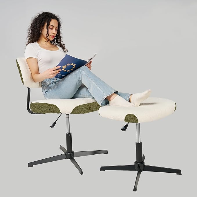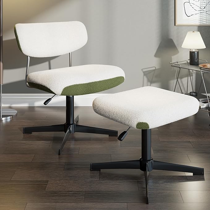 Swivel Criss Cross Chair, Accent Chair with Ottoman Set, Modern Armless Chair with Ergonomic Backrest, Comfy Chair with Boucle Upholstered Seat, No Wheels, White & Green