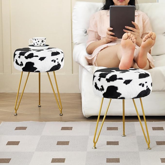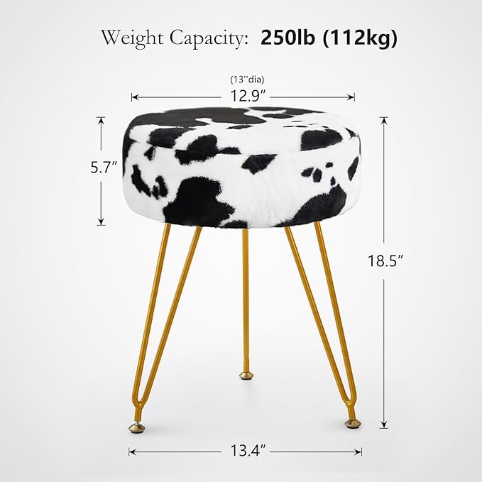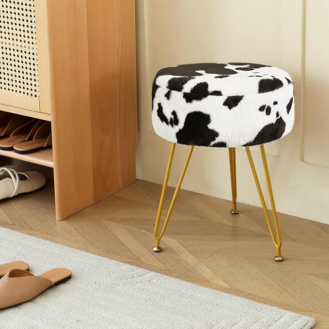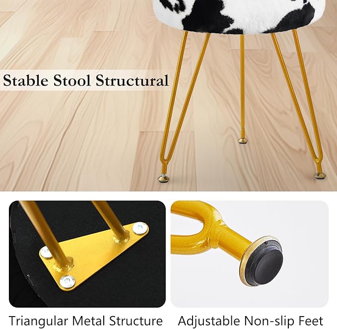 Faux Fur Vanity Stool Chair, Round Makeup Vanity Chair with Adjustable Metal Legs & Soft Padded Seat, Ottoman Foot Stool for Bedroom, Living Room, Entryway, Cow
