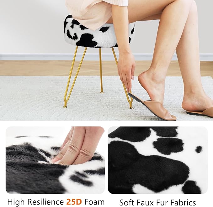 - PREMIUM MATERIALS: The vanity chair is made of faux fur fabric, with a soft and fluffy surface, and warmth, with a certain degree of moisture absorption and breathability, and it is not easy to sweat when sitting on the faux fur makeup stool in summer.The uniquely designed vanity stool with a black and white imitation cowhide pattern adds a touch of fun and vitality to your home or office space.