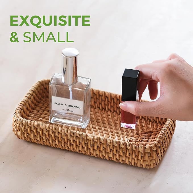 - Optimal Size Tray Decor: Measuring 8.2 x 4.3 x 1.6 inches, this rattan tray is perfect for holding jewelry, perfume, and other small treasures. Its compact size makes it ideal for organizing and displaying your favorite items