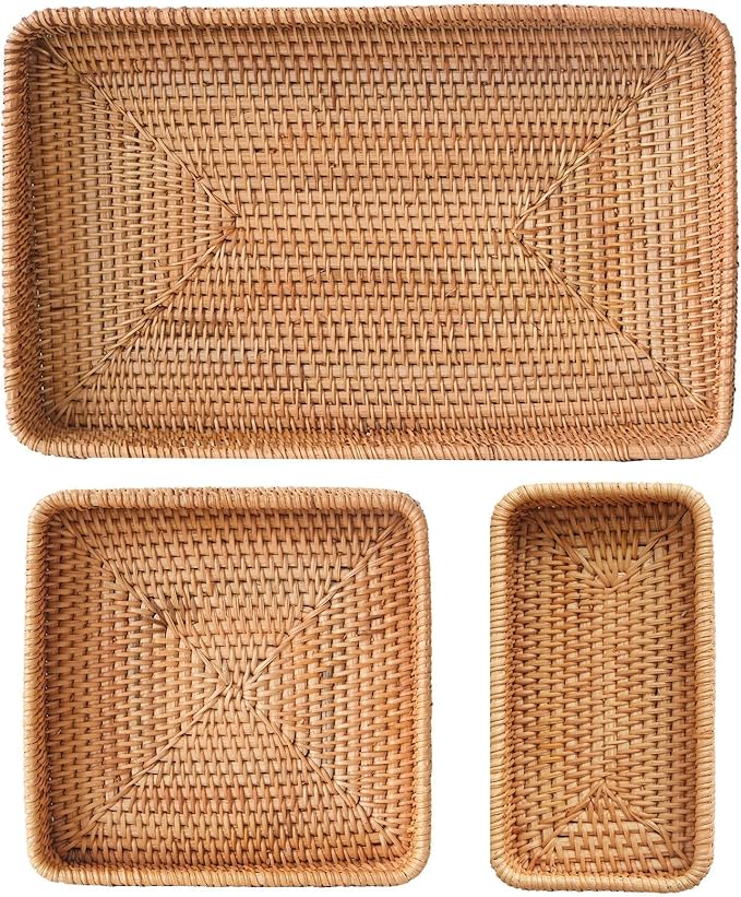 Rattan Serving Tray, Rectangle Basket Set of 3, Wicker Storage and Organizing Baskets, Natural Decorative Woven Tray for Home Decor, Bathroom, Kitchen Counter