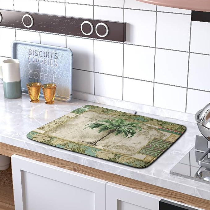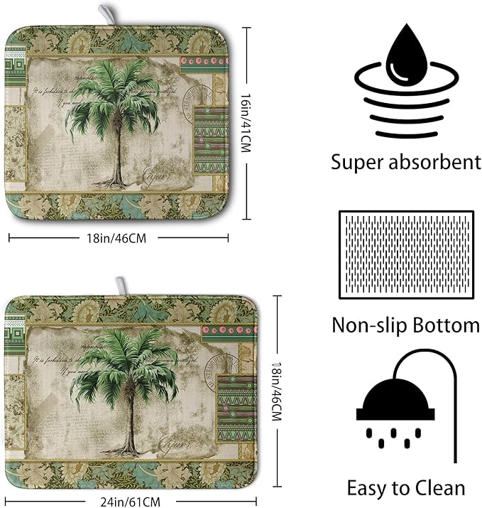 - 【Ultra Absorbency】The surface of the palm tree dish drying mat is made of absorbent microfiber and the middle is made of composite sponge, absorbs 4X its weight in water, keep your counter dry. Absorbent, Colorful, Reversible, do not fade.