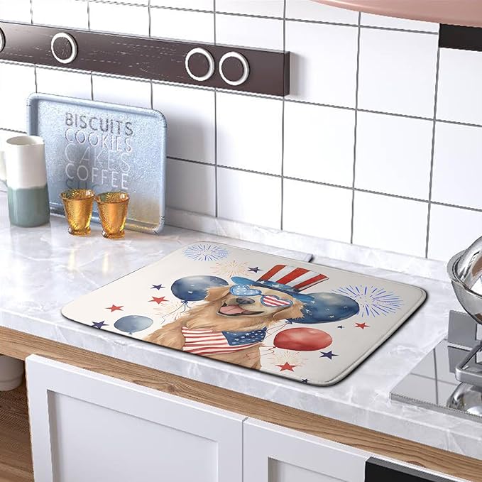 4th of July Patriotic Dog Dish Drying Mat 18 x 24 Inch US Independence Day Blue White Red Kitchen Drying Mat Firework Holiday Dish Drainer Mats Super Absorbent Dish Rack Pad for Kitchen Counter