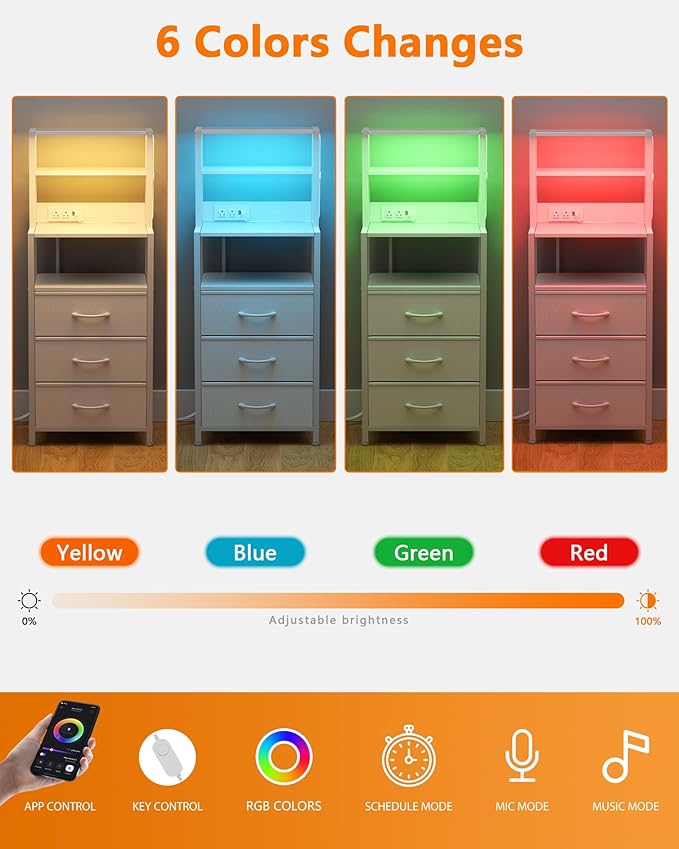 Furnulem Night Stand, Bedside Nightstand with 4-Tier Shelves and 3 Fabric Drawers, LED Bed Side Tables with Charging Station, Tall Bedside Table for Bedroom, Hallway, Office,White