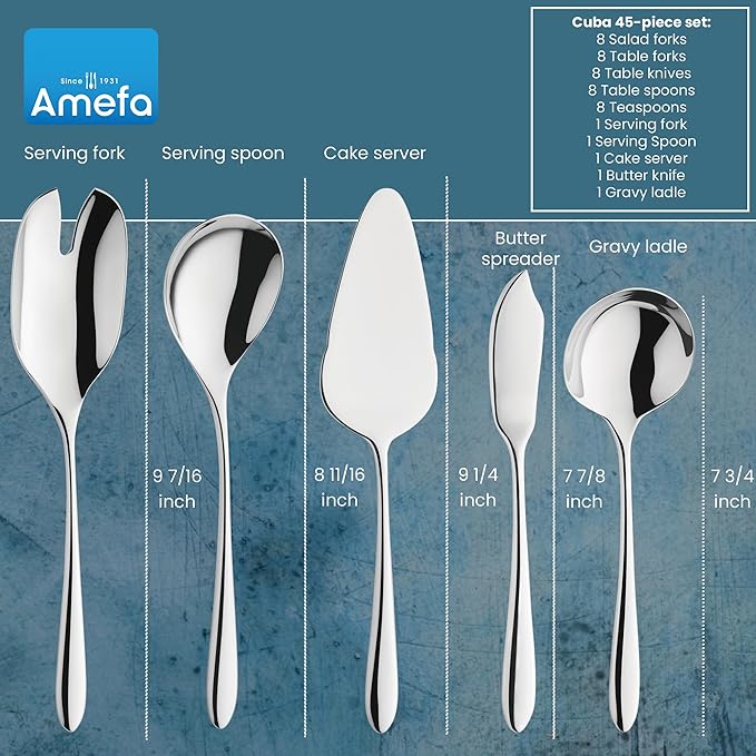 - Service For 8: 45-piece flatware set includes 8 Salad forks, 8 Table forks, 8 Table knives, 8 Table spoons, 8 Teaspoons, and a 5pc Serving set