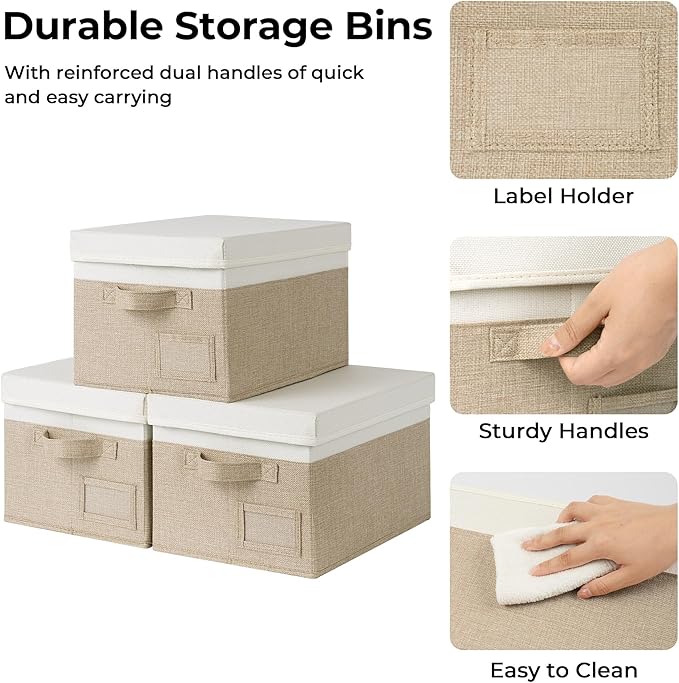 GRANNY SAYS Storage Basket with Lid, Linen Fabric Storage Bins for Shelves, Decorative Storage Boxes, Clothes Storage and Organization, Memory Keepsake Box, 3-Pack, Khaki&Ivory