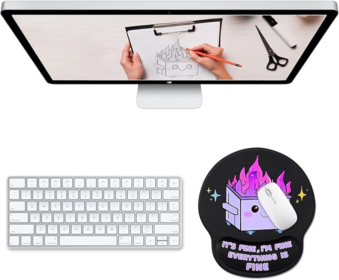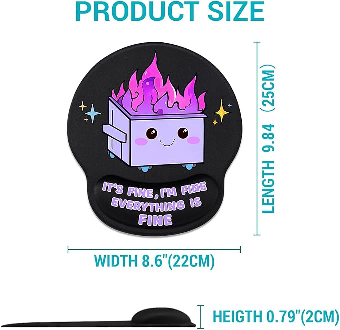- 【Unique Design】This gel mouse pad with wrist rest features a cute funny dumpster on fire pattern design: It's Fine I'm Fine Everything is Fine, which will bring you more happiness while working, studying or playing. The mouse pad for desk also fits all types of desktop, keyboard, laptop and wireless computer mouse.