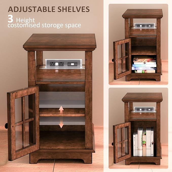 HIFYOBRO End Table with Charging Station, Narrow Side Table with Storage, Nightstand for Small Spaces with USB Ports & Power Outlets Bedside Table-Cherry