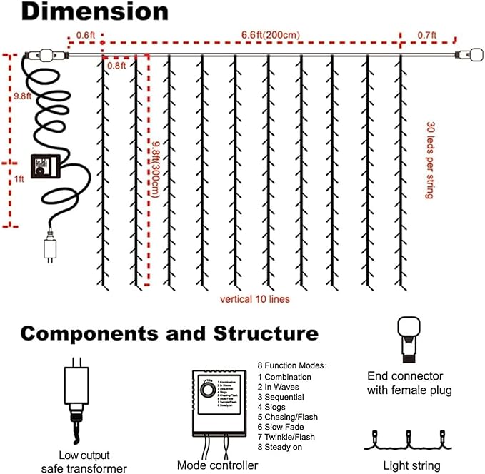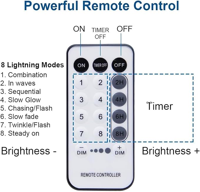 - 8 Lighting Modes: This holiday decorative string light has 8 lighting modes for you to choose: combination, in waves, sequential, slogs, chasing/flash, slow fade, twinkle/flash, and steady on. Fit different occasions and environment, adjust the lighting modes by using remote control or pressing the round button on the black mode controller box