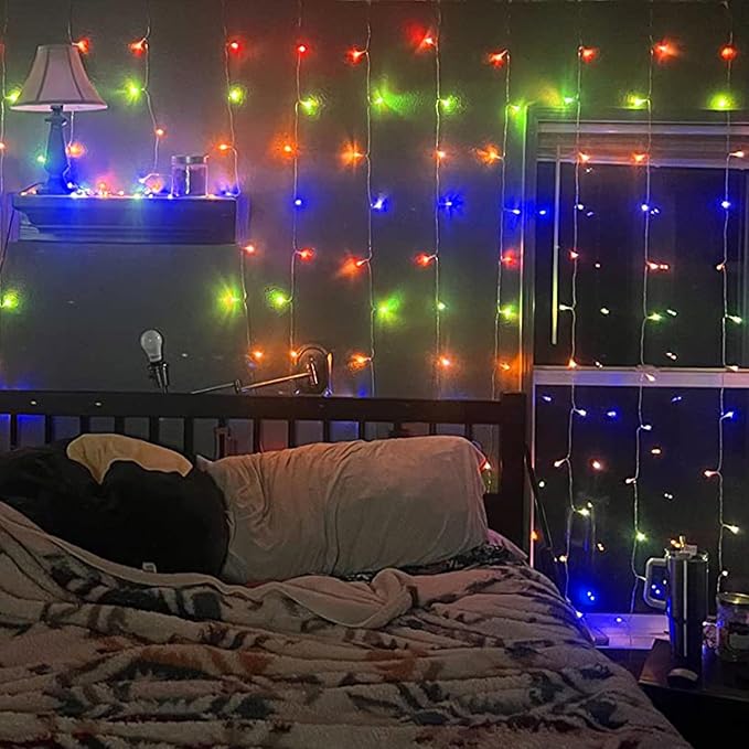 - Christmas Curtain Lights: Decorate with our 300 LED Christmas Multicolor curtain string lights with transparent wire, creates a warm festive atmosphere, surely lights up your room and house. A warm welcome sign at night to make your home a wonderful sight for your neighbors! US standard outlet, voltage 110V. Adapter to the first LED light: 9.8ft. Light size: 6.6 x 9.8ft