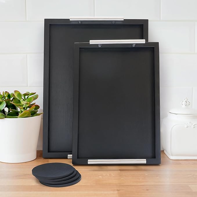 - ✔ APPROXIMATE DIMENSIONS: Large Tray - 15.7” x 11.8” x 2.4” inch; Small Tray - 13.4” x 9.4” x 2.4” inch; Coaster Dimensions - 10 x 10 cm. Our tray offers two unique sizes that can meet your different needs from serving to displaying decorative objects. Also, nest them together for smaller spaces. Our 4 extra coasters tie in your beautiful trays to create an aesthetic decor that can fit any space