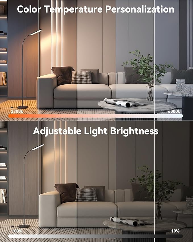 - Stepless Colour Temperature Brightness: Floor lamp for living room can choose the brightness in the range of 10%-100% brightness, colour temperature in the range of 2700K-6000K, adjusted according to your needs through remote(Batteries included)