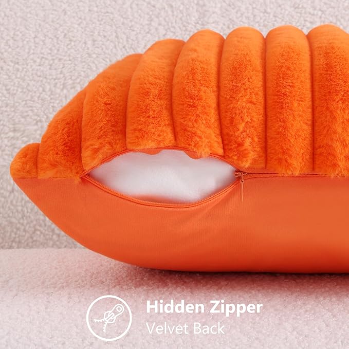 decorUhome Faux Fur Fall Throw Pillow Covers 20x20 Set of 2, Decorative Soft Plush Striped Neutral Couch Euro Pillow Covers with Velvet Back for Sofa, Bed, Living Room Home Decor, Orange