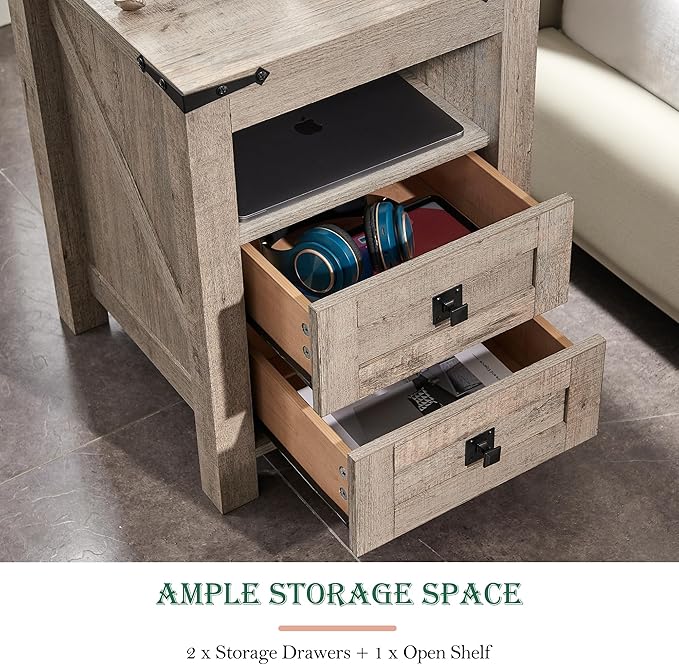 RedLemon Farmhouse Nightstand with Charging Station, Rustic 18 Inch End Table with 2 Storage Drawers and Open Shelf, Wood Sofa Side Table for Bedroom, Living Room (Light Rustic Oak)