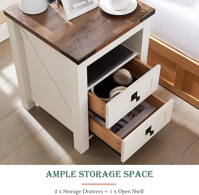 RedLemon Farmhouse Nightstand with Charging Station, Rustic 18 Inch End Table with 2 Storage Drawers and Open Shelf, Wood Sofa Side Table for Bedroom, Living Room (Antique White)