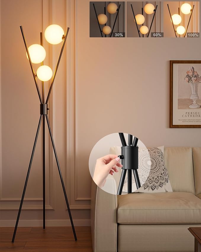 Lightdot 60IN Dimmable Black Tripod Floor Lamp Mid Century Standing Lamps with 3Pcs 3000K G9 Bulbs Globe Eye Care&Stable Base Modern Tall Lamp for Living Room Bedroom Office
