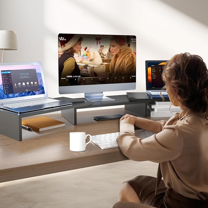 - SPACIOUS STORAGE UNDERNEATH - It elevates the monitors to comfortable viewing height up to 104mm, creates an additional large storage, allowing you to put your keyboard, mouse, DVD players, cell phones, iPad, tablets, sticky notes, business cards, and other desk accessories under the shelves, makes your workplace instantly spacious and tidy.