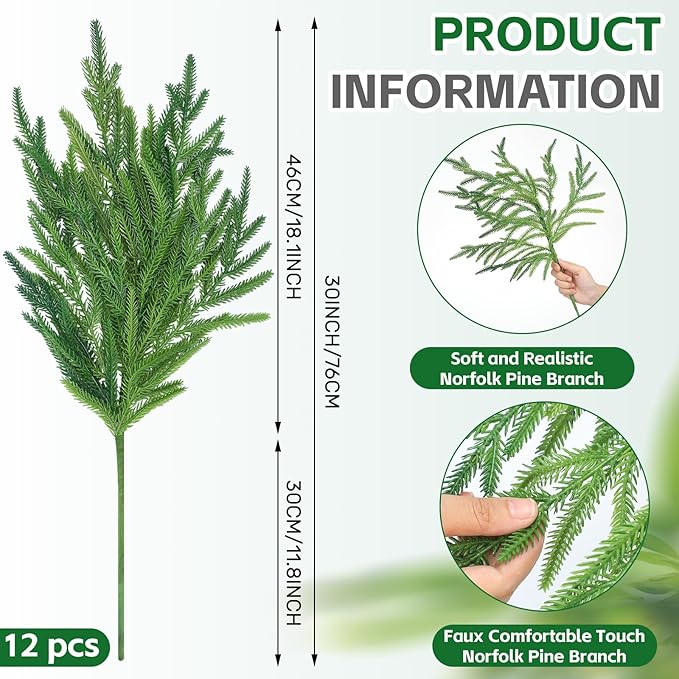 - Flexible Bendable Stems: each Norfolk pine branch has a bendable wire core, allowing you to shape, fluff, and curve them freely. The sturdy stem fits easily into vases and can meet your various Christmas decor DIY needs