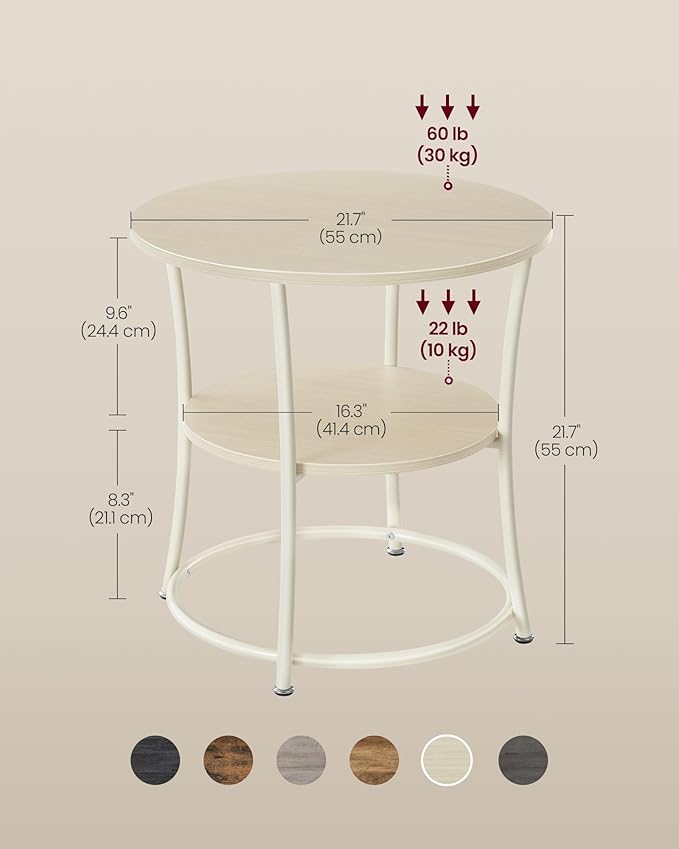 - Robust and Reliable: The 21.7" diameter side table features stable steel legs reinforced by round tubes, supporting up to 66 pounds on the top shelf for lasting use