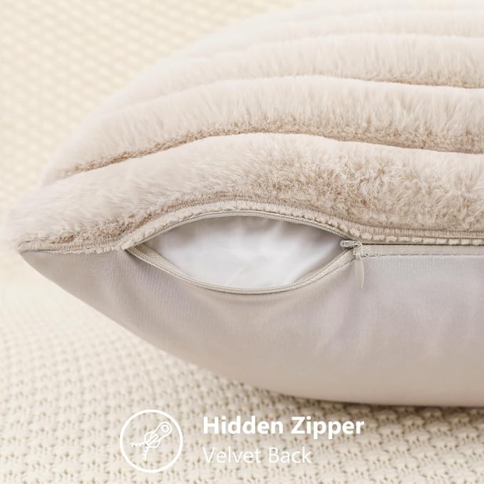 decorUhome Faux Fur Throw Pillow Covers 16x16 Set of 2, Decorative Soft Plush Striped Neutral Couch Euro Pillow Covers with Velvet Back for Sofa, Bed, Living Room Home Decor, Beige