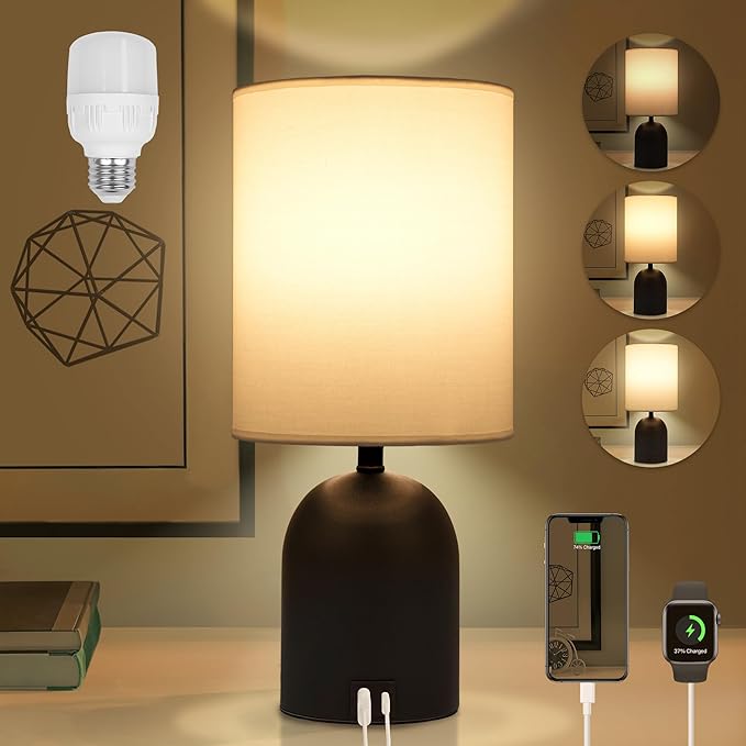 Bedside Table Lamp for Bedroom, 3 Way Dimmable Touch Nightstand Lamp with USB C and A Ports Small Table Desk Lamp for Bedroom, Living Room, Reading Room, Kids Room, Office, Dorm Black/White