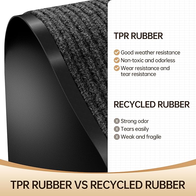 - [DEEP GROOVES TO CAPTURE DIRT AND MOISTURE]: Designed with high density polyester topside and deep grooves, our indoor door mats for entryway effectively captures dirt, mud and moisture. Even rainy, snowy or muddy weather, it will keep your home dry and clean