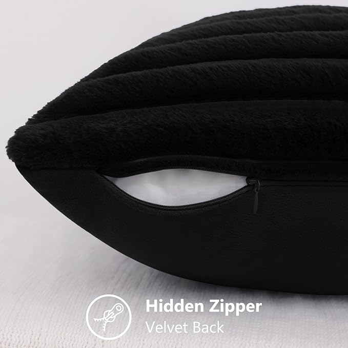 decorUhome Faux Fur Throw Pillow Covers 20x20 Set of 2, Decorative Soft Plush Striped Neutral Couch Euro Pillow Covers with Velvet Back for Sofa, Bed, Living Room Home Decor, Black