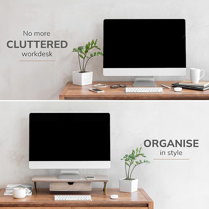 - Elegant Desk Shelf: Enhance your workspace with this sophisticated desk shelf, designed as a desk riser to elevate your monitor. The monitor stand riser ensures ergonomic comfort while adding a refined touch to any office.