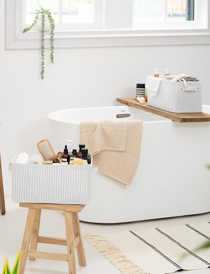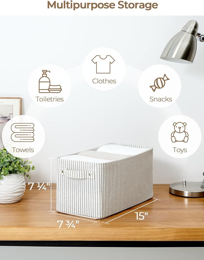 StorageWorks Narrow Storage Bins, Small Basket for Closet and Shelves, Rectangular Fabric Organizer with Handles, Toilet Paper Storage, Khaki and Beige Stripes, 2-Pack