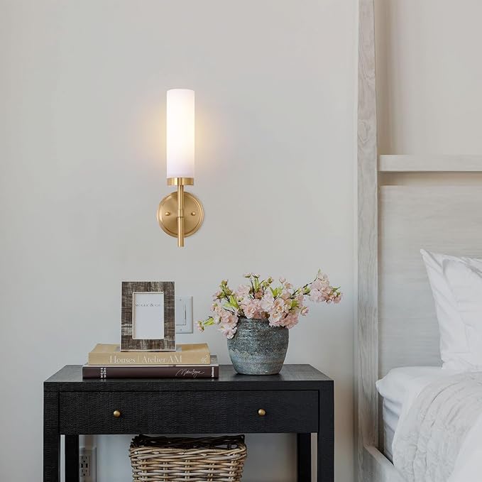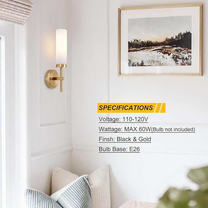 Gold Bathroom Wall Sconces Set of 2, Modern Sconces Wall Lighting Vanity Light Fixtures with Opal White Glass Shade, Brushed Brass Wall Lights for Mirror Living Room Bedroom Hallway Kitchen Stairs