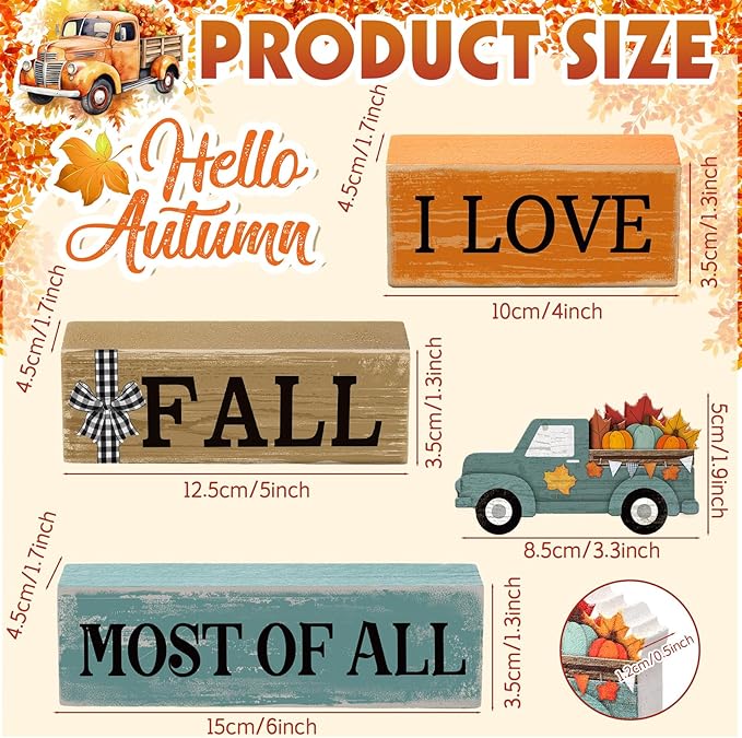 - Ideal Dimensions: the fall wood book stack comes with a truck desk decoration measuring 3.3 x 1.9 inches; Besides, there are 3 fall wooden centerpieces of varying sizes included in the package, 4 x 1.7 x 1.3 inches, 5 x 1.7 x 1.3 inches, and 6 x 1.7 x 1.3 inches, blend of sizes and designs to suit your display needs