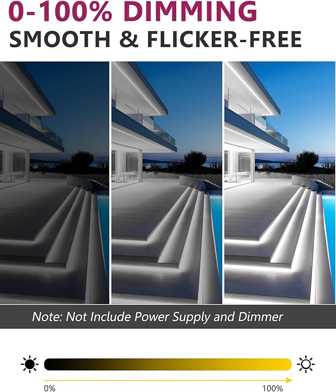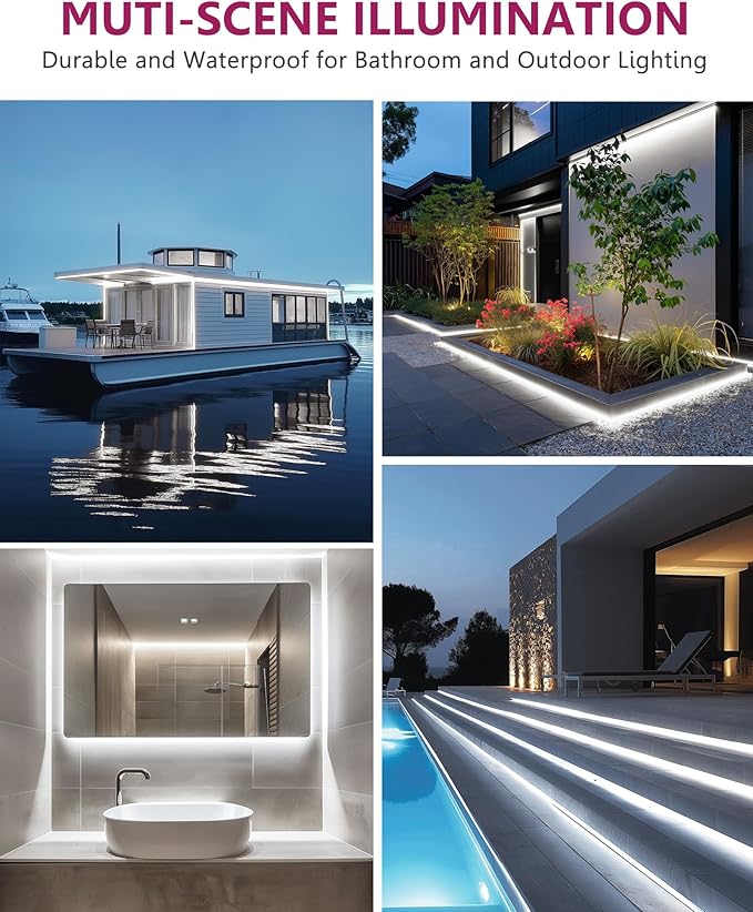 - MUTI-SCENE ILLUMINATION: Our 5000K cool white LED tape lights can be dimmable with a compatible 24v dimmer; It's perfect for various indoor/outdoor uses including bathroom, pool, rv camper awning, patio, roof, landscape, backyard, garden and else