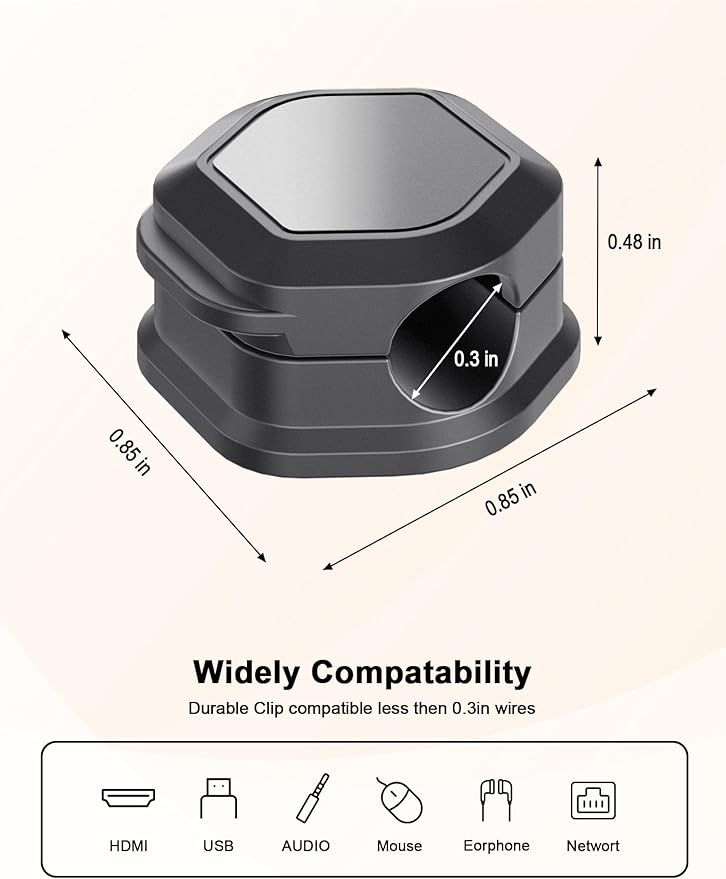 - 【Perfect Cable Slot Diameter】Magnetic Cable Clips Suitable for holding most desktop cables less than 0.3in. This desktop cable management can be used for iPhone charger cables, USB cables, network cables, kitchen appliance power cord and so on.