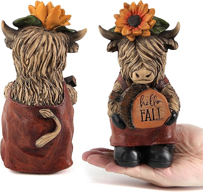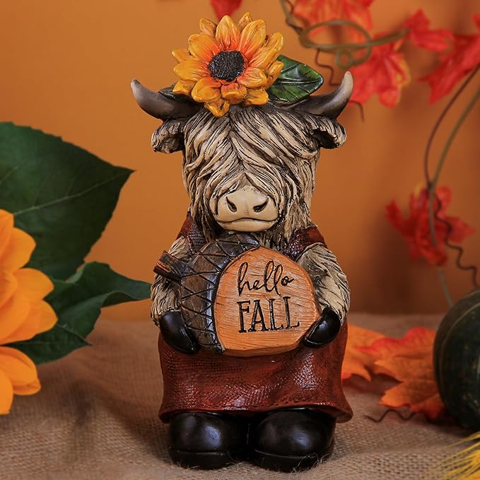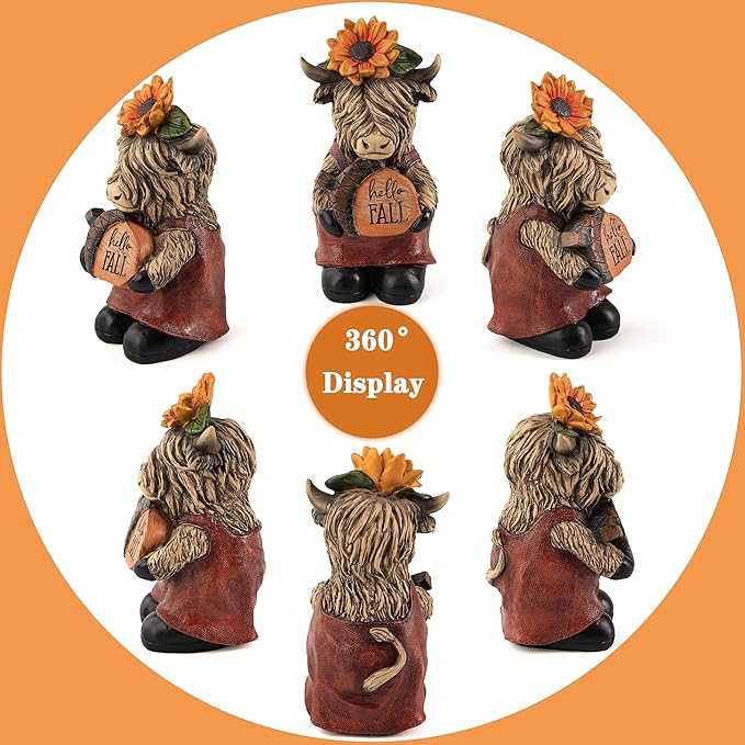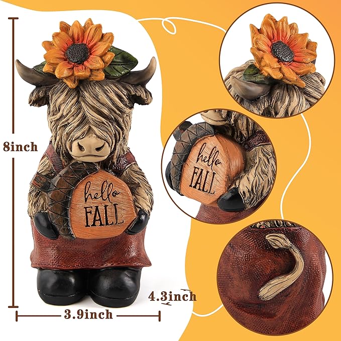 - Unique design:The highland cow statue is overhead with sunflower and holding a “Hello Fall” acorn, celebrating for fall, harvest and thanksgiving, which is a nice touch to holiday decorations.
