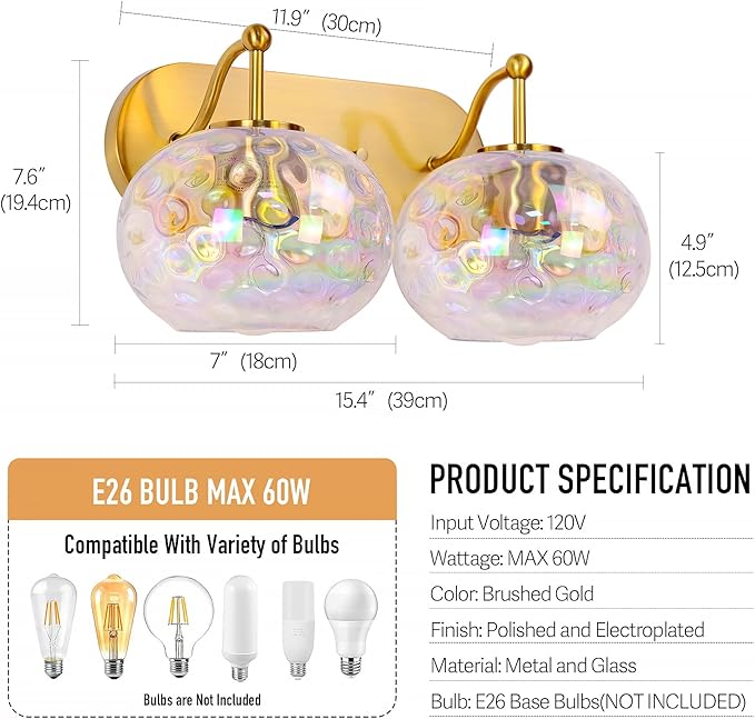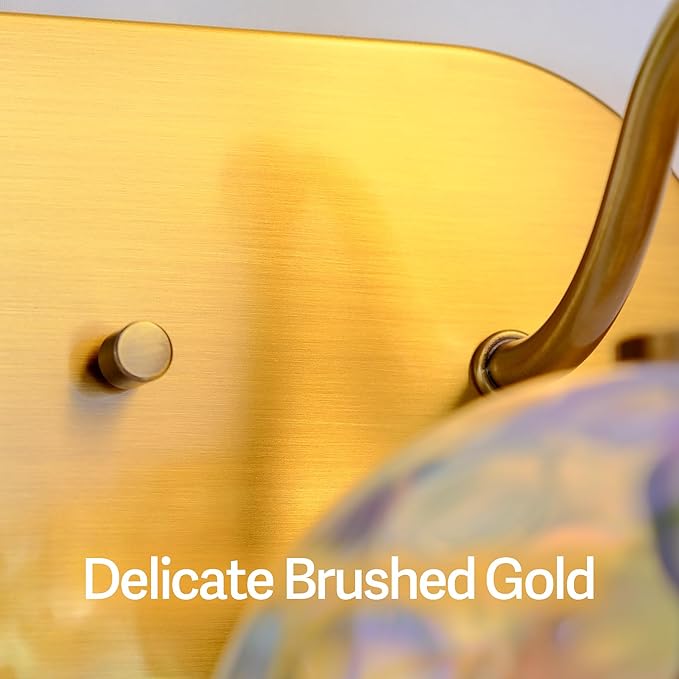 - 【Stunning Hammered Glass】This luxury modern vanity lighting features 2 gorgeous stained hammered glass shade with brushed brass gold metal finished, creating a captivating centerpiece that adds a touch of happiness and cheerfulness to any room. The combination of modern and artistic vibes makes it a unique statement piece for your home.