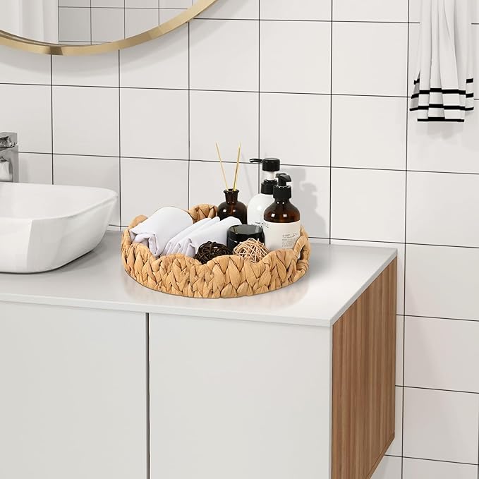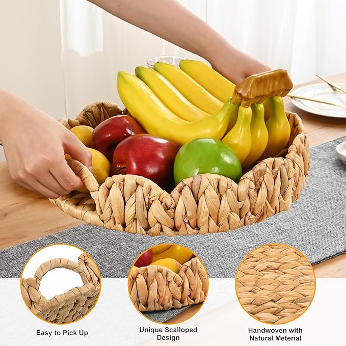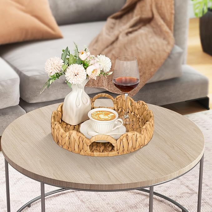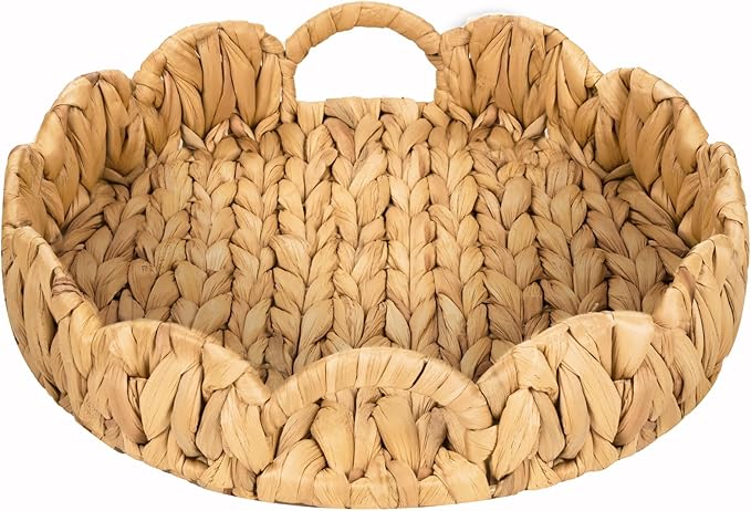 Livofloral Scalloped Edge Round Serving Tray, Handwoven Rattan Tray with Built-in Handles, Decorative Scalloped Basket Tray for Coffee Table, Water Hyacinth Wicker baskets for Ottoman
