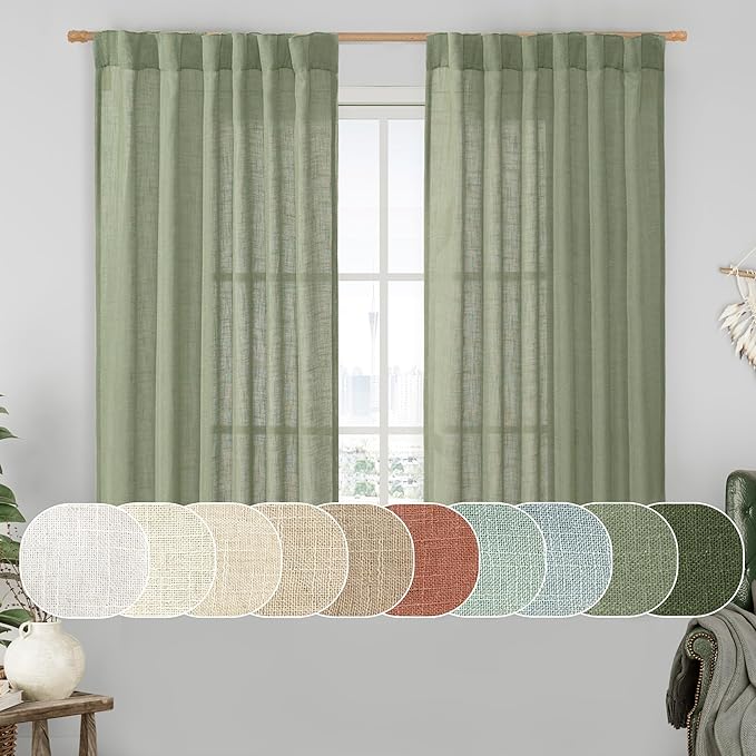LAMIT Semi Sheer Linen Curtains 45 Inches Long 2 Panels, Sage Green Light Filtering Panels Back Tab and Rod Pocket Neutral Drapes for Kitchen/Window/Bedroom, 52 x 45 Inch