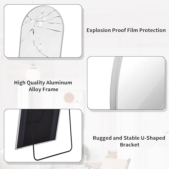 - Unique Design: The top of the floor mirror is designed with a unique smooth arched-top frame, which especially attracts people's attention and highlights the beauty of the mirror. The thin aluminum alloy frame makes the mirror looks more classic and it is suitable for dressing in any room