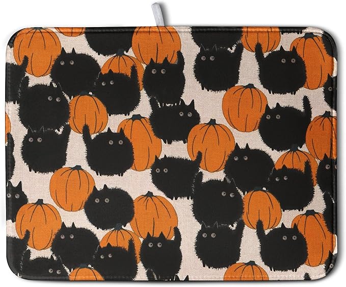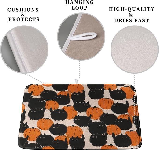 - 【Multifunctional Pad】Beautiful print on surface side, and reverses to a solid color. The halloween cat drying pad absorbs water well, great for air drying dishes, glasses, bottles, silverware, fruits and vegetables, adds stability when drying fragile items.
