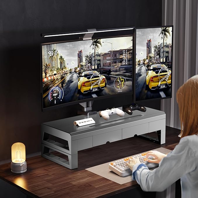 - 【Wide Compatibility】The monitor riser has a universal size design, compatible with printers, computers, and laptops. Its desk leg width can accommodate most keyboards, and the non-slip rubber pads provide stability during use