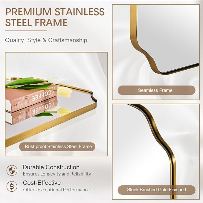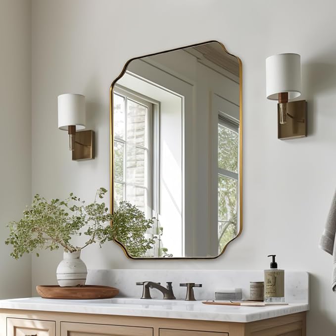 - 【Aesthetic Scalloped Edge Design】: Elevate your bathroom decor with our brushed gold rectangle scalloped mirror boasting a stylishly sculpted frame. Crafted with intricately curved rounded edges, each corner showcases a captivating concave scalloped arc, ensuring an eye-catching addition to any space