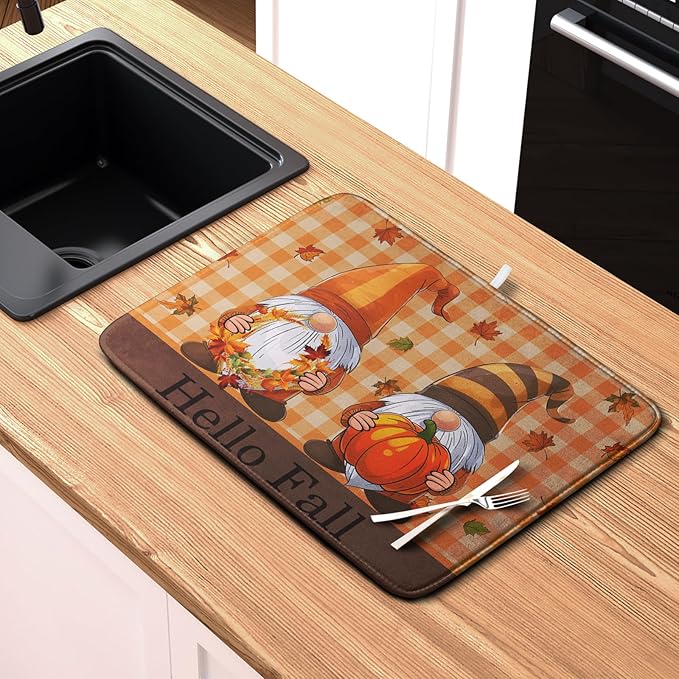 - 【Protect Countertop】The autumn gnome dish drying pad keep the countertop dry, protects your counters from scratches and scuffs. Fits perfectly under the dish drying rack / drainer. It also protects under small appliances such as a mixer, blender, or coffee maker.